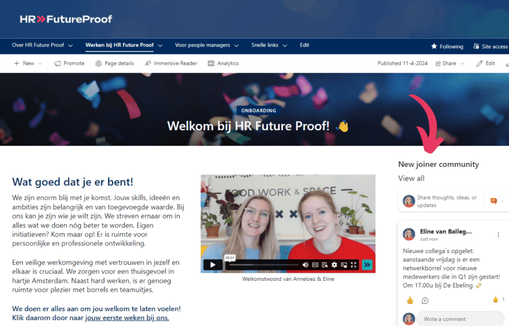Een manier om dit te doen is om een evenement voor new joiners te organiseren. Maar je kunt het ook digitaal faciliteren door een community op te richten voor nieuwe medewerkers. Dit doe je in Viva Engage: het ‘Facebook’ binnen Microsoft. Zo’n community embed je in een paar klikken op jouw SharePoint pagina die over onboarding gaat. Zo voelt het voor de nieuwe medewerker niet als wéér een nieuwe tool.