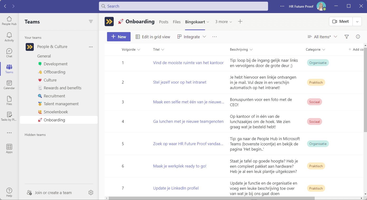 In onze BINGO app voor Microsoft Teams vind je per categorie vier (te personaliseren) onboarding acties. Zo leert de nieuwe medewerker jullie organisatie op een leuke en laagdrempelige manier kennen!